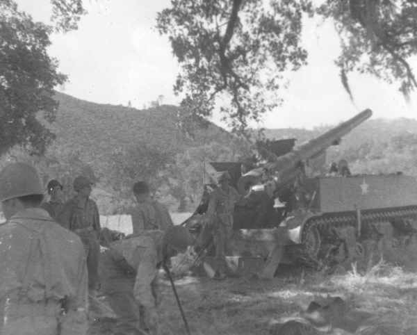 Section 1, B Battery, 558 th F.A. training with M-12 at Fort Hunter Liggett, 1943