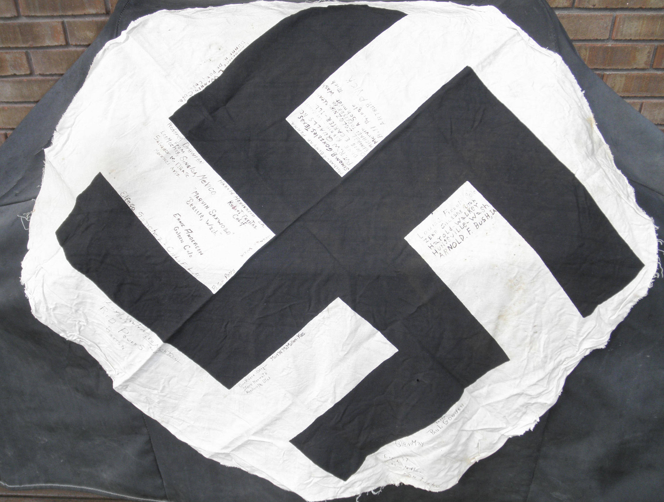 Signed swastika from a German hanging banner "captured" by Malcolm Jones of the 558th.