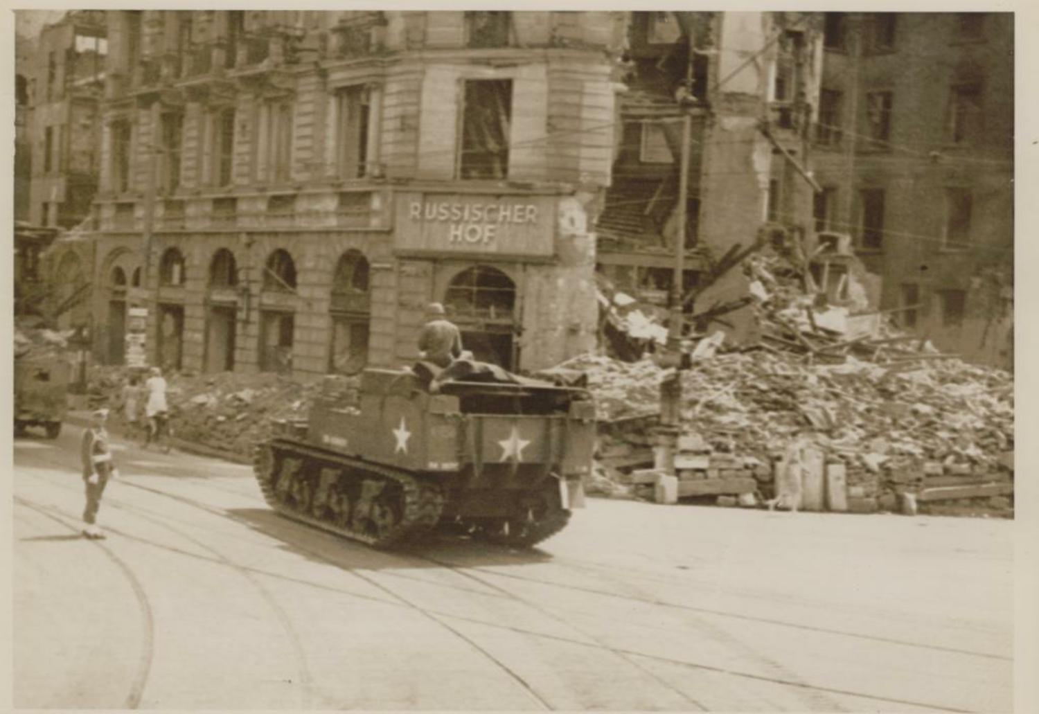A 557th FAB M30 Carrier driving in front of "Russian Hotel" in Germany