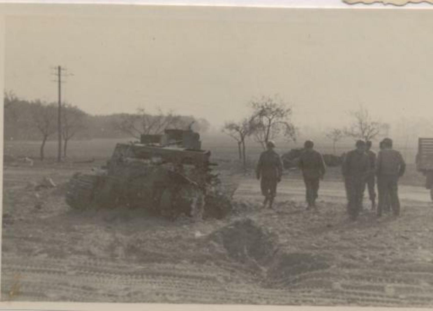 This destroyed M30 Carrier was fully loaded with ammo when they were caught on the road and straffed by an ME 109. The two soldiers in it were obviously killed. In one of the pictures you can see the other half of it over across the street.